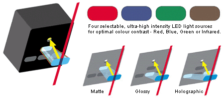 For the first time, an operator can see the reflected line, edge or pattern characteristics by monitoring the high-resolution, two-line back lit display. Maximum contrast can be achieved on matte, glossy or even holographic backgrounds by selecting from three built-in reflective incidence angles and four LED colours.