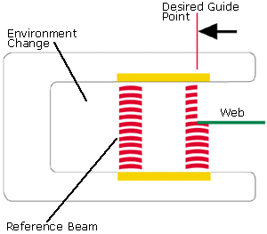 IR energy is emitted in two beams: The attenuation of the blockage beam indicates the position of the material in the edge detector, and the intensity of the reference beam indicates the degree to which the environment is affecting the blockage beam. The controller's microprocessor evaluates the two beam intensities to determine true web position. Like AccuWeb's ultrasonic array edge detectors, the compensation point moves with the guide point to provide robust calibration over the entire detection range. The moving compensation point also eliminates potential guide point drift due to localized contamination build up.